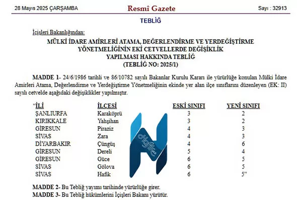İçişleri Bakanlığının, 24/6/1986 tarihli ve 86/10782 sayılı Bakanlar Kurulu Kararı ile yürürlüğe konulan Mülki İdare Amirleri Atama, Değerlendirme ve Yerdeğiştirme Yönetmeliğinin ekinde yer alan ilçe sınıflarını düzenleyen (EK: II) sayılı cetvelde yapılan değişiklikler ile bazı ilçelerin sınıfları yeniden düzenlendi.